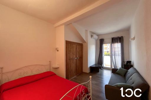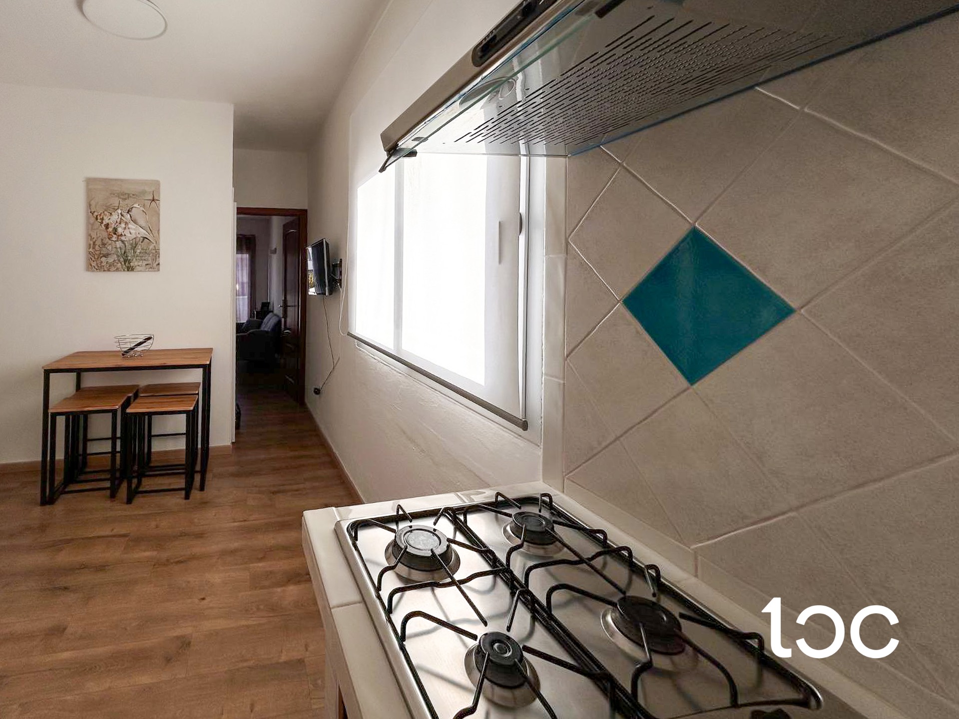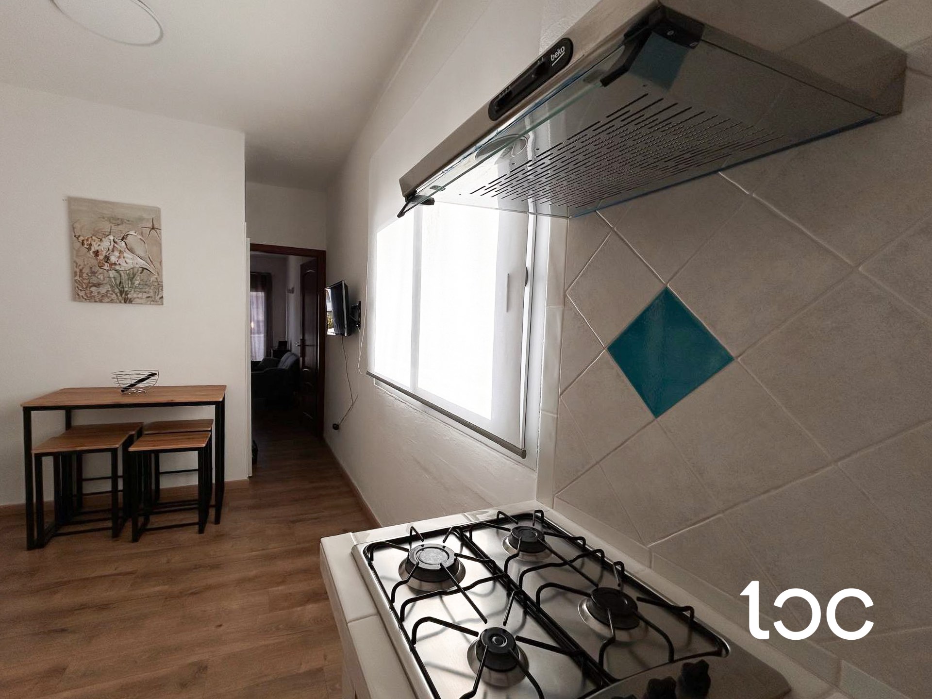 Il bilocale offre un soggiorno con angolo cottura, una camera matrimoniale ampia con divano, una veranda vivibile e un solarium panoramico con vista su Budoni.