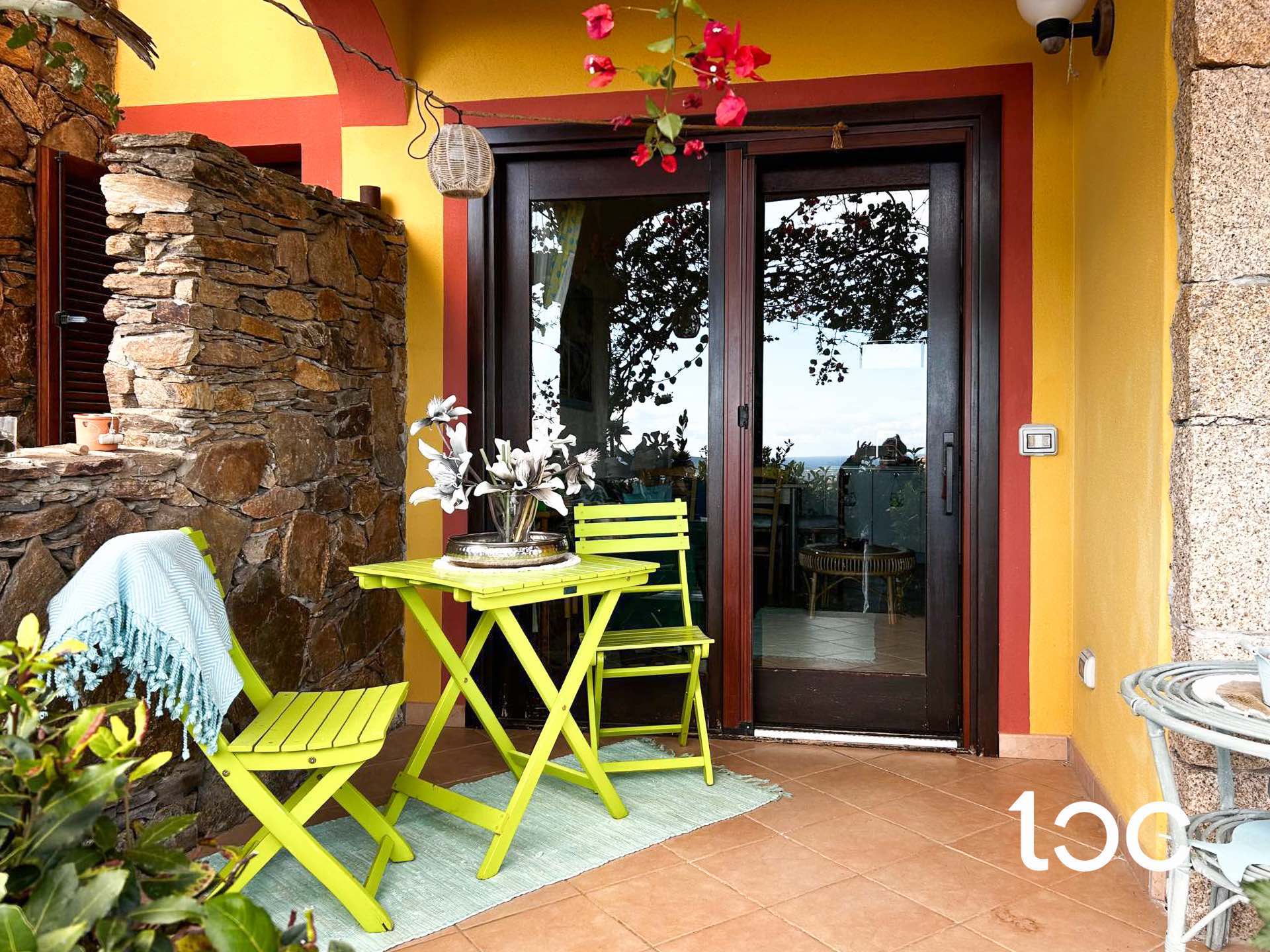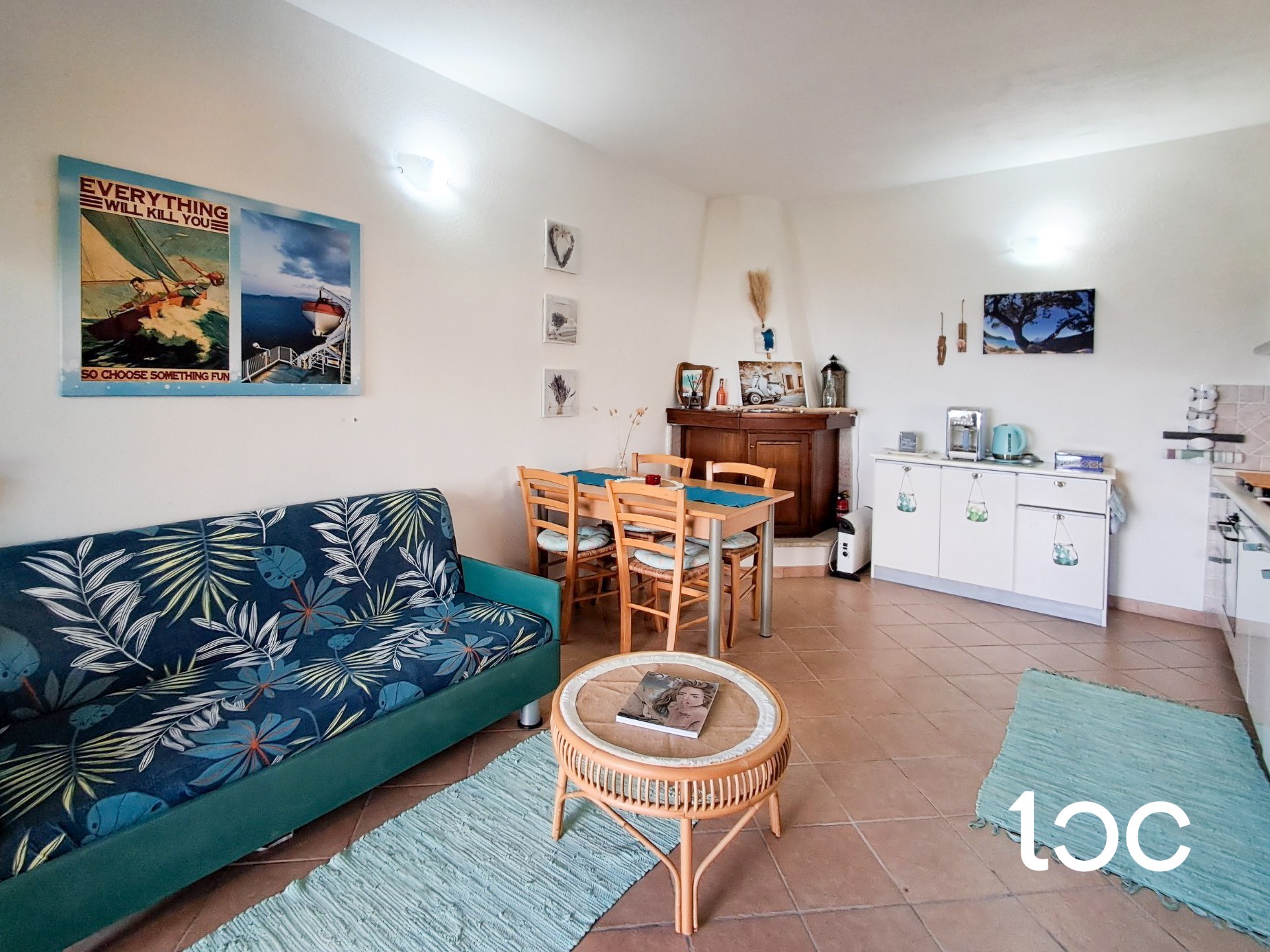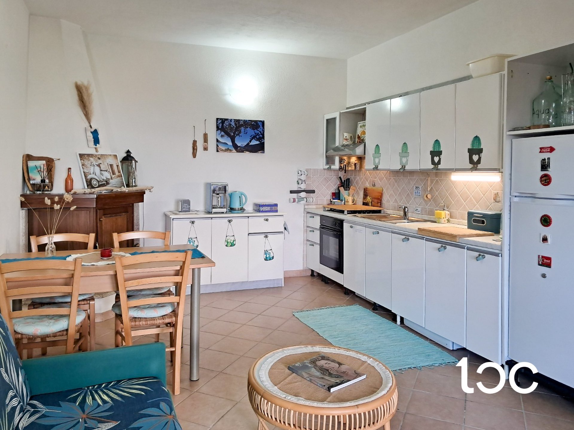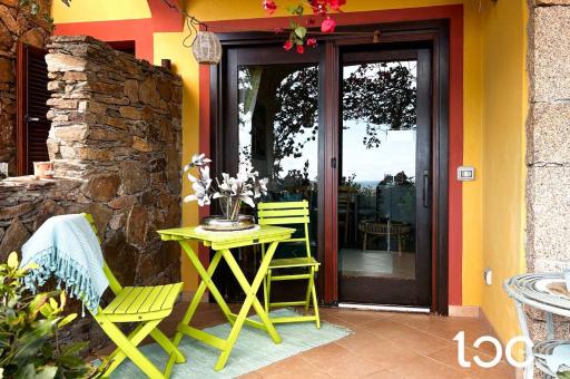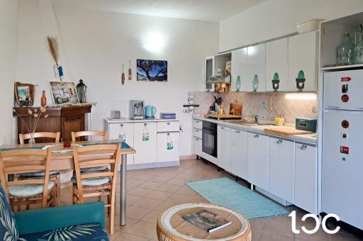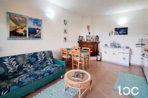 Die Wohnung, die über einen eigenen Garten verfügt, hat eine Veranda mit Panoramablick, von der aus Sie einen herrlichen Blick auf das Meer genießen können, und von der aus Sie Zugang zu einem großen und hellen Wohnzimmer mit Essbereich, Kochnische und Kamin haben.