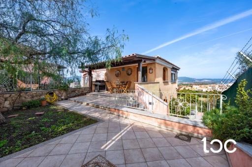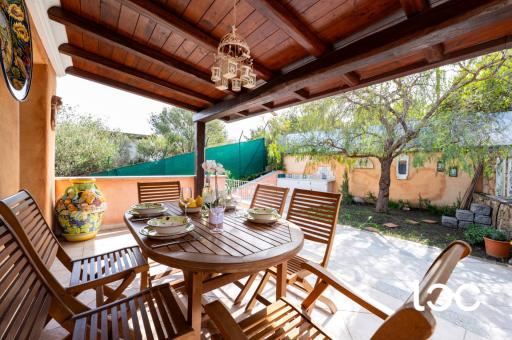Zur Ausstattung gehören eine gepflegte Einrichtung, Wasserspeicher, Klimaanlage, Außendusche und Abstellraum. Hochwertige Ausführung in sardischem Stein und Granit.