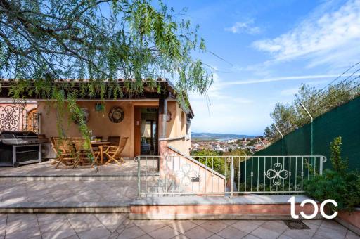 Der Zugang zur Immobilie erfolgt durch ein erstes Tor, das zu einer praktischen Garage führt, die sich frontal befindet. Die Immobilie umfasst einen komfortablen privaten Garten, der zur Eingangsterrasse des Hauses führt.