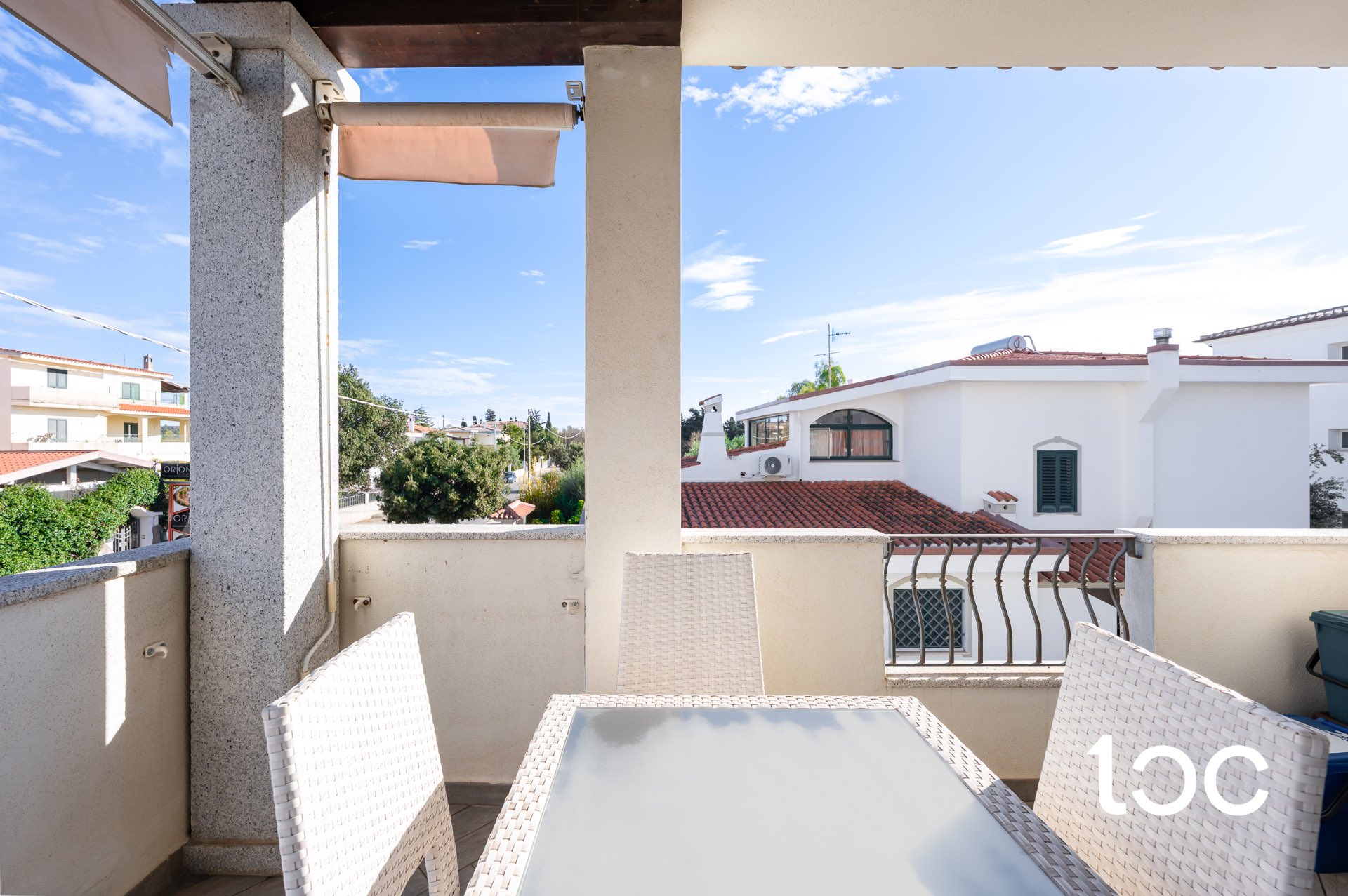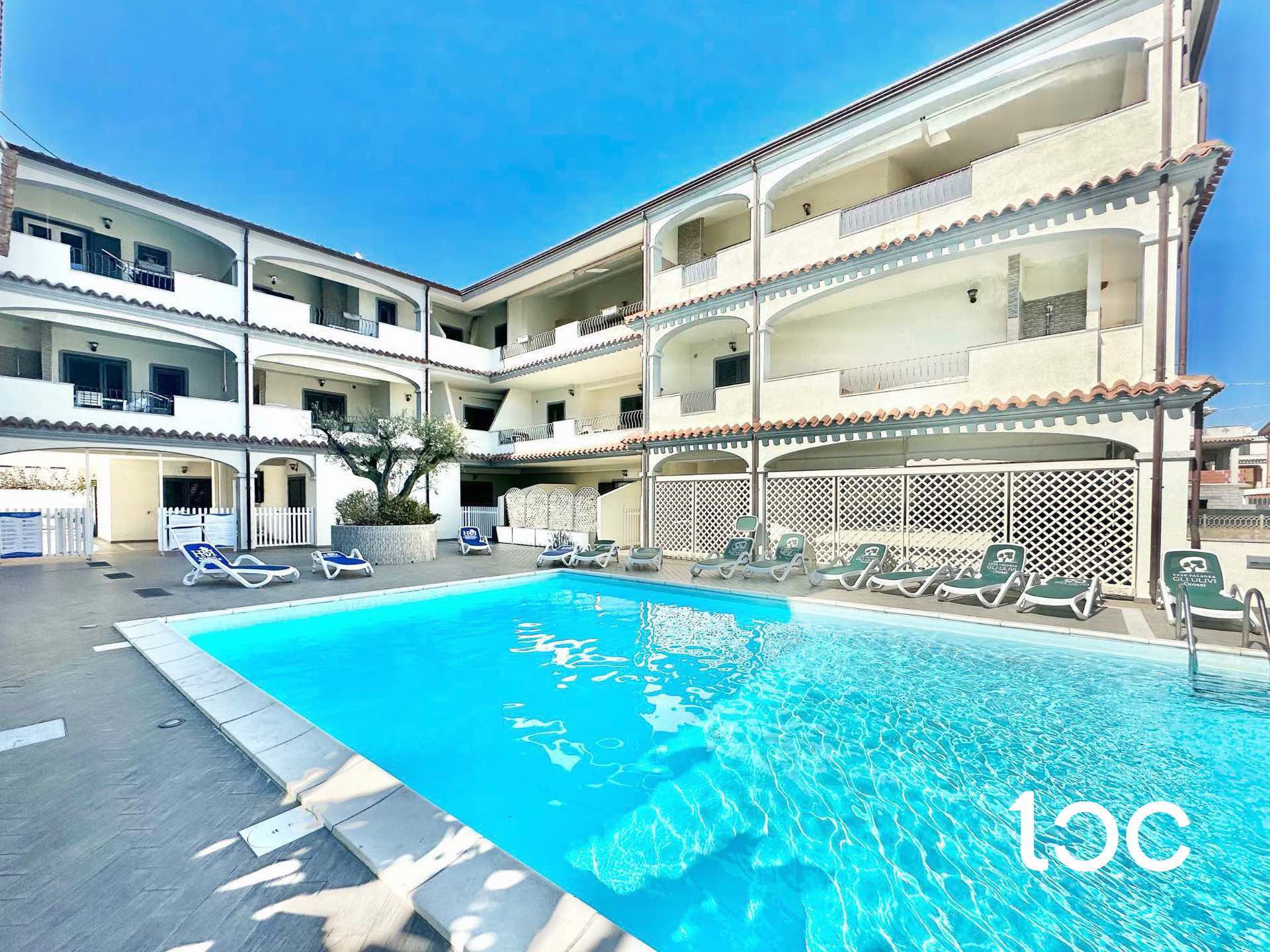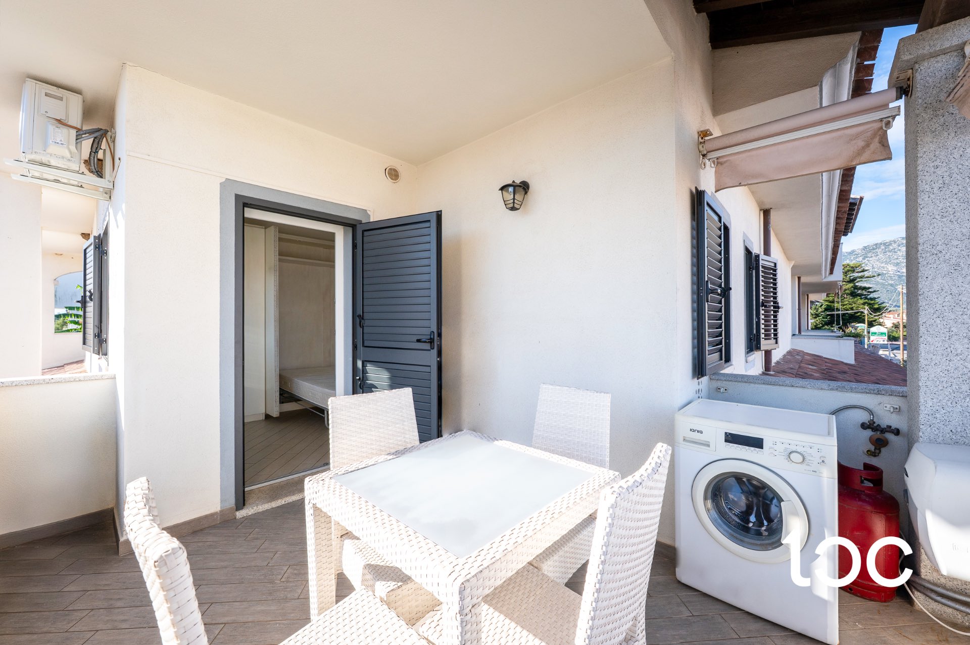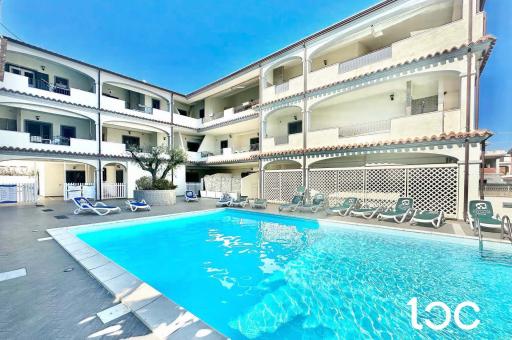 Die wunderbare Veranda, die direkt auf den Swimmingpool der Wohnanlage blickt, ist ideal, um sich zu entspannen oder angenehme Abende mit Freunden zu verbringen.