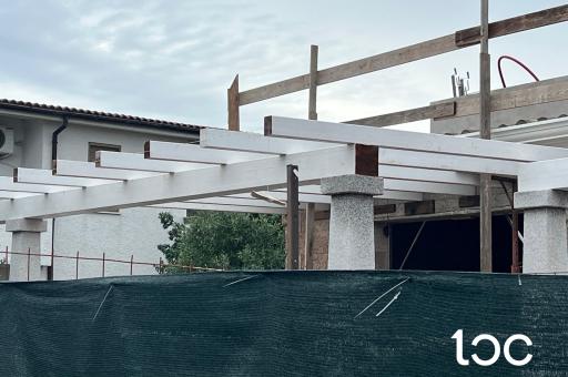 Der Privatparkplatz garantiert Komfort und Sicherheit, während die steinerne Auffahrt elegant zum Eingang des Hauses führt und die Außentreppe zum Panorama-Solarium führt, das sich ideal zum Sonnenbaden oder als ausgestatteter Bereich eignet.