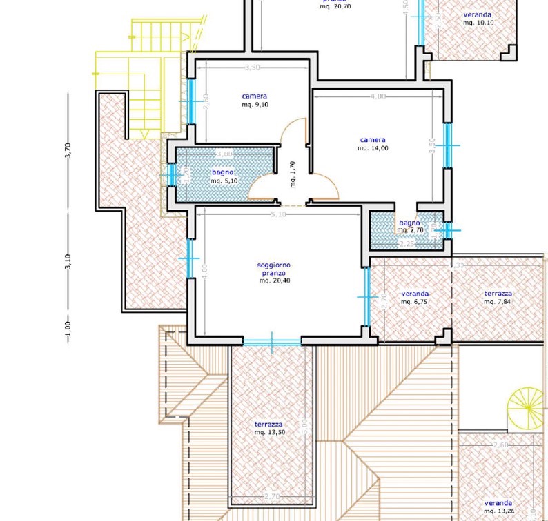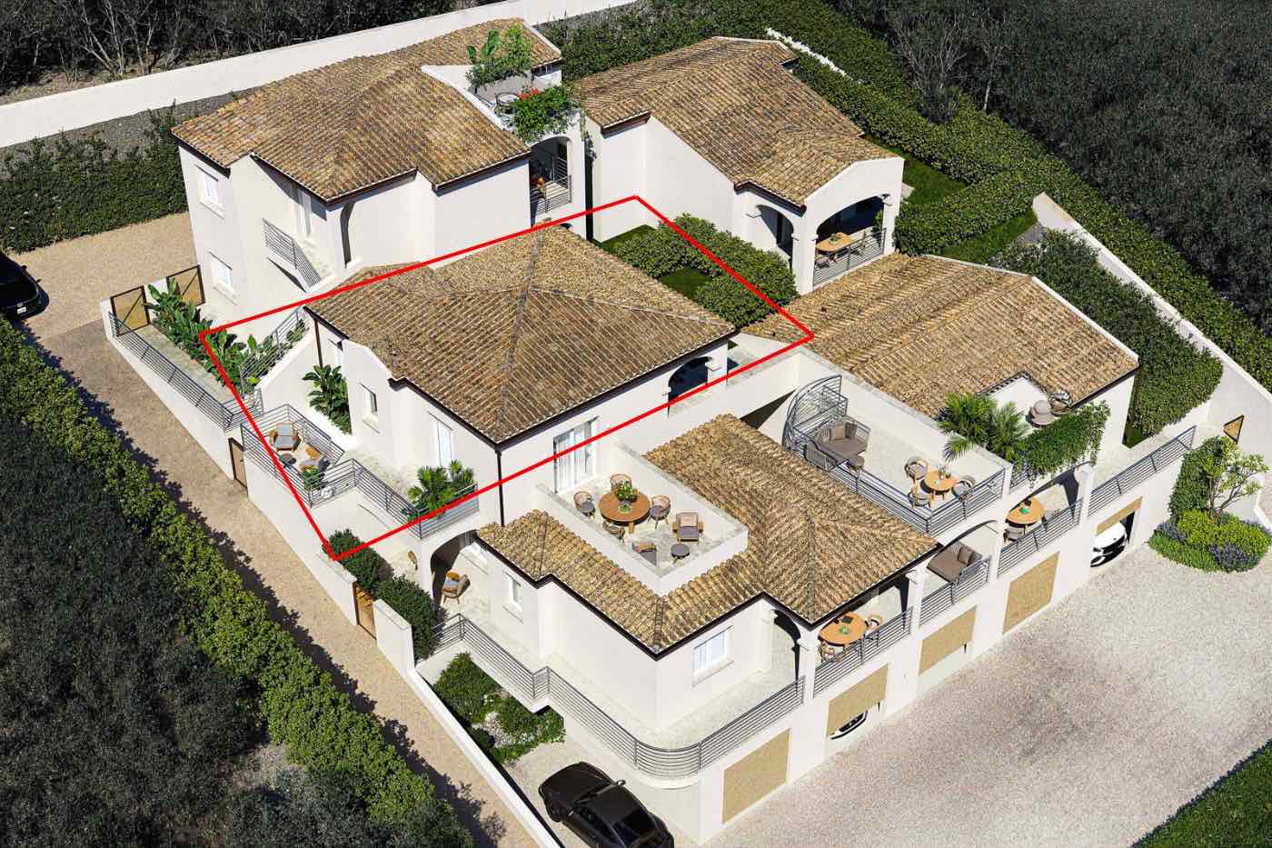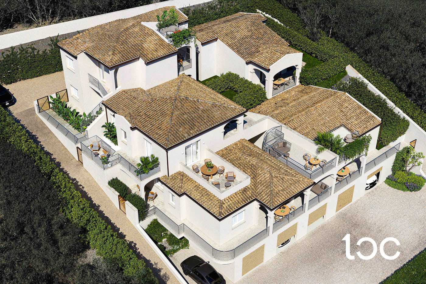 Das architektonische Projekt verbindet zeitgenössische Linien mit einer sorgfältigen Integration in den natürlichen Kontext: versetzte Volumen und geneigte Dächer passen sich der Morphologie des Ortes an, wobei sie die mediterrane Tradition mit einem modernen Ansatz aufnehmen.