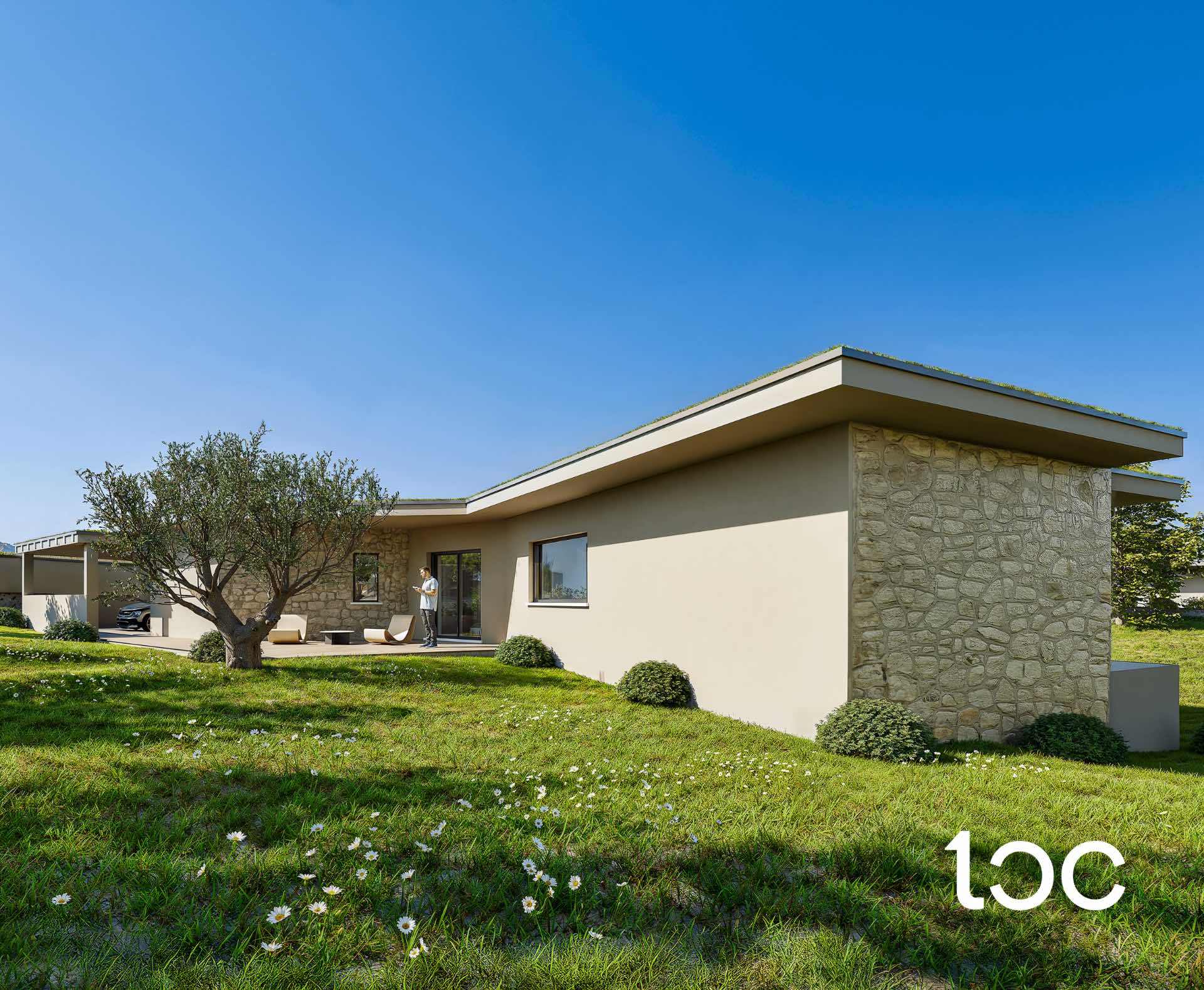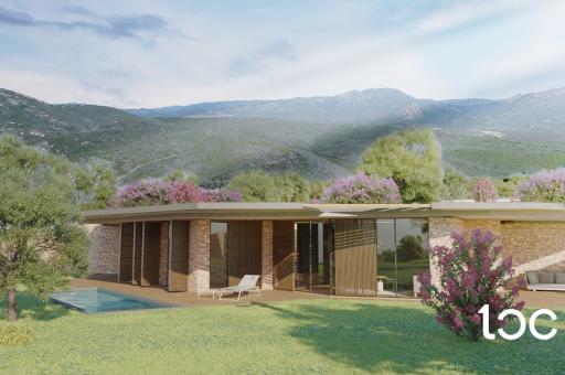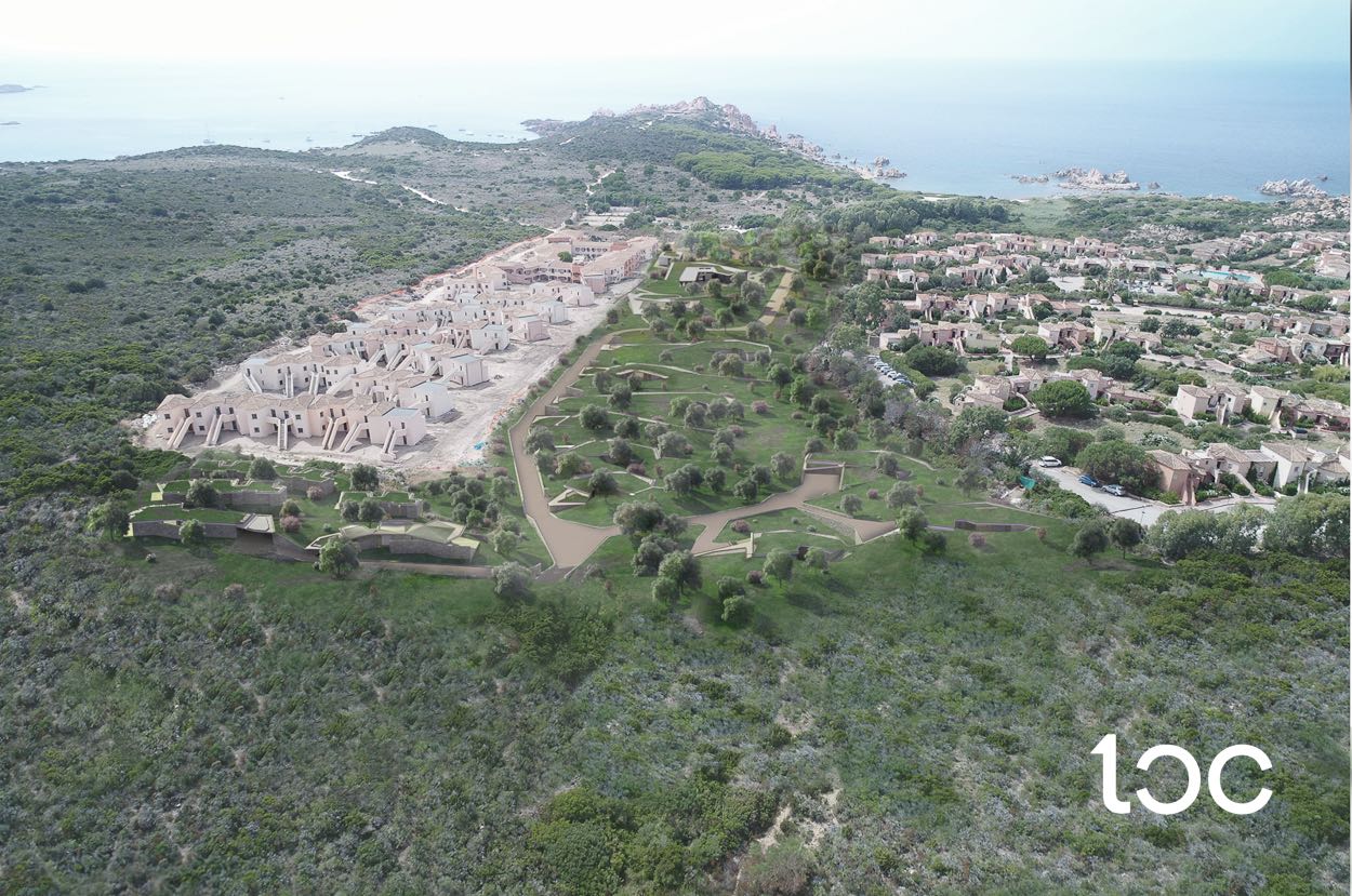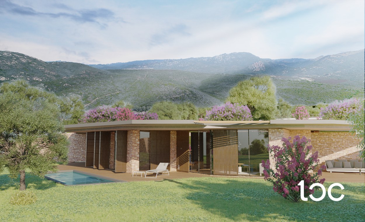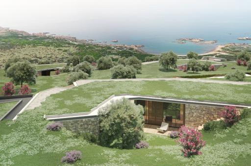 Die Villa wurde so entworfen, dass sie sich perfekt in die Landschaft einfügt. Sie ist teilweise in das Grundstück gebaut und befindet sich auf einer Ebene, mit einem begrünten Dach, sardischen Steinmauern und natürlichen Terrassen, die sich in die umliegende Landschaft einfügen.
