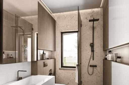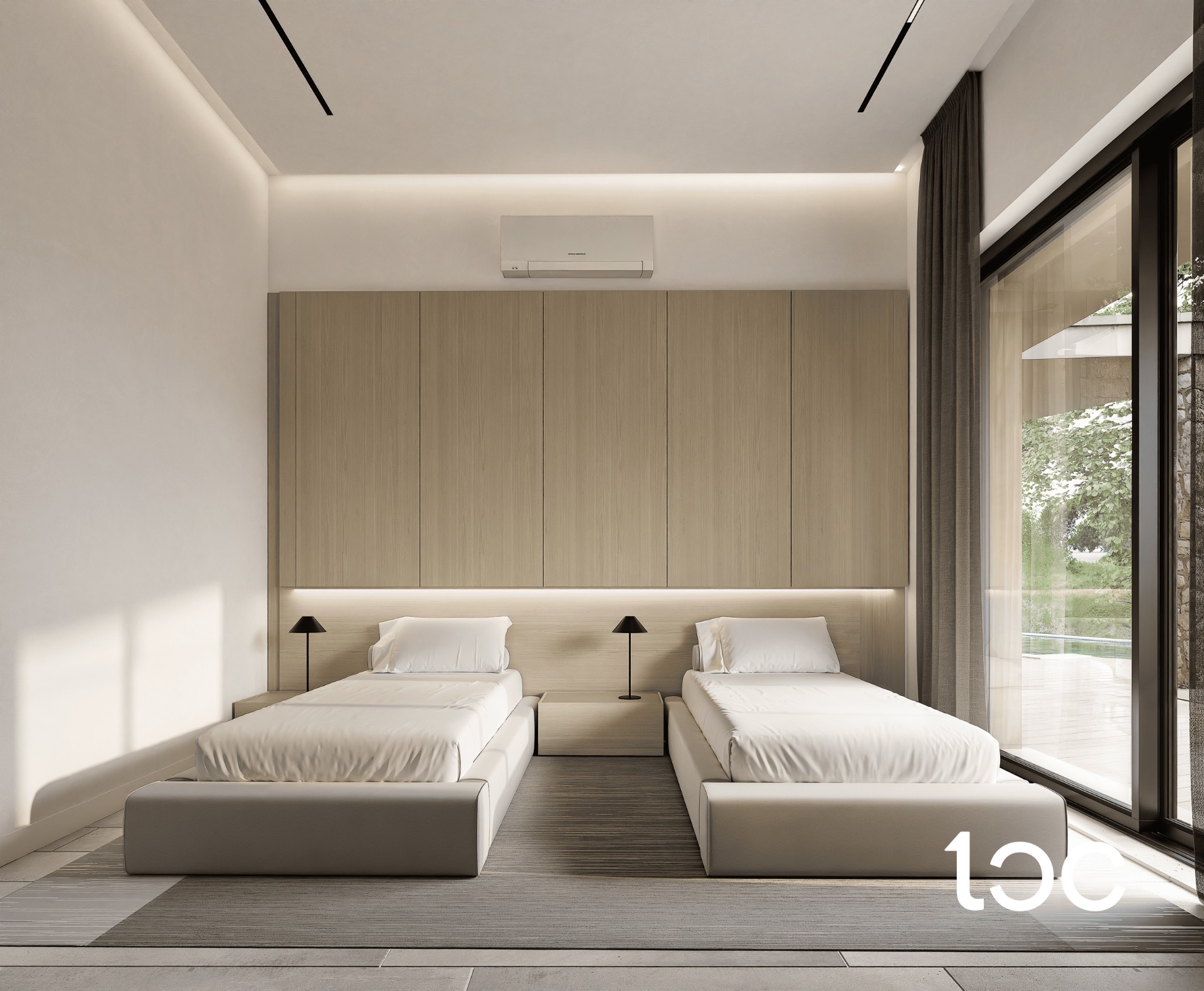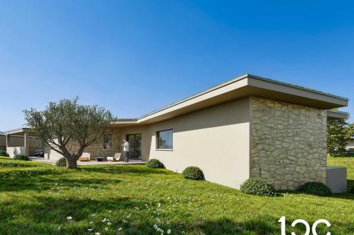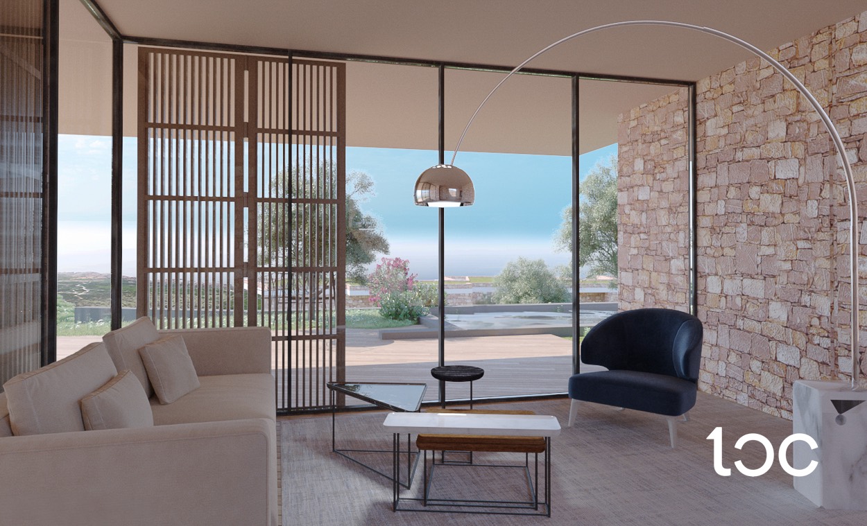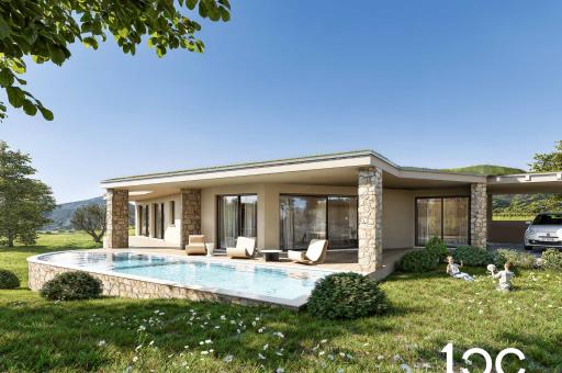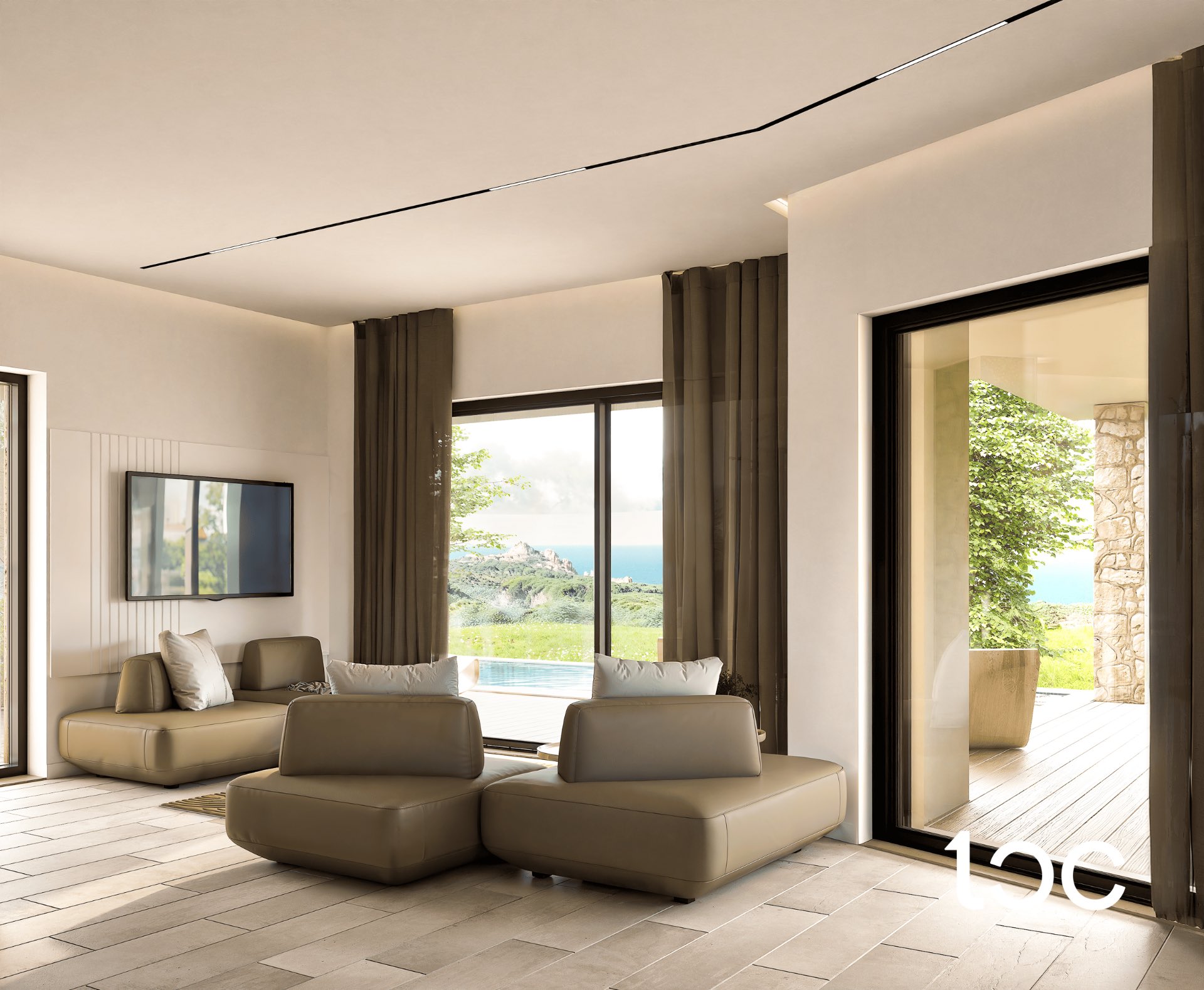 Die Villa wurde so entworfen, dass sie sich perfekt in die Landschaft einfügt. Sie ist teilweise in das Grundstück gebaut und befindet sich auf einer Ebene, mit einem begrünten Dach, sardischen Steinmauern und natürlichen Terrassen, die sich in die umliegende Landschaft einfügen.
