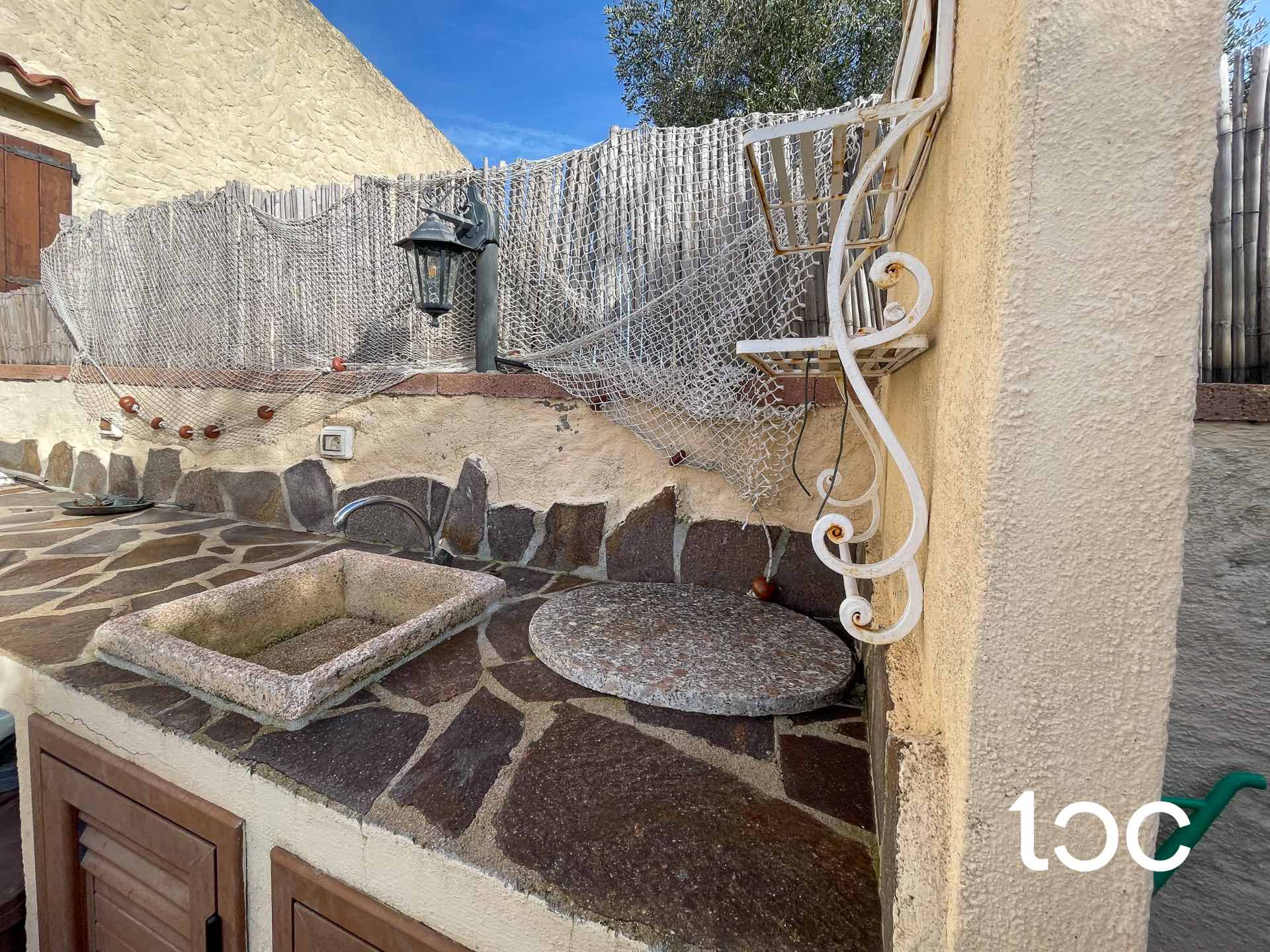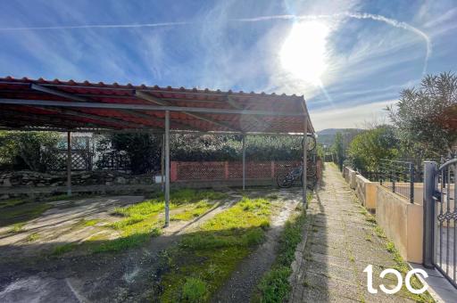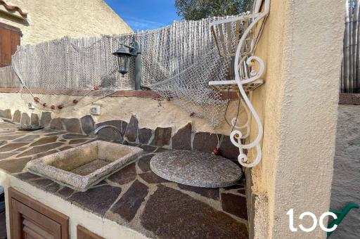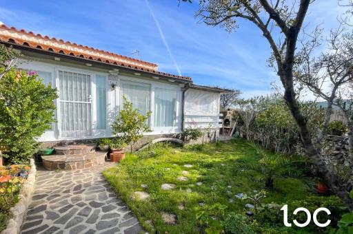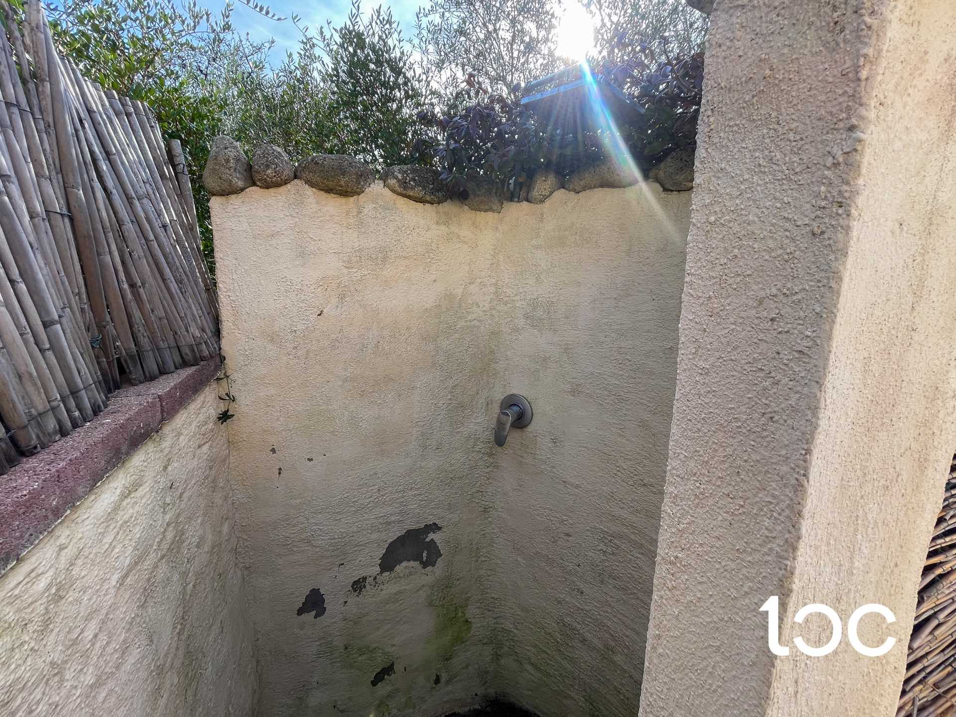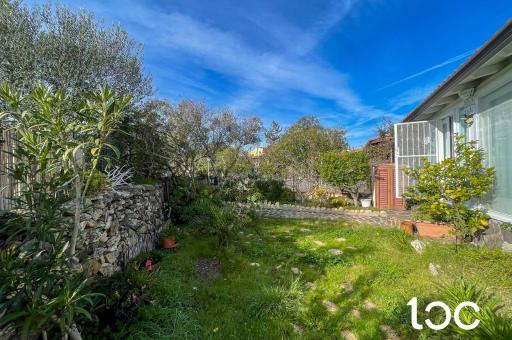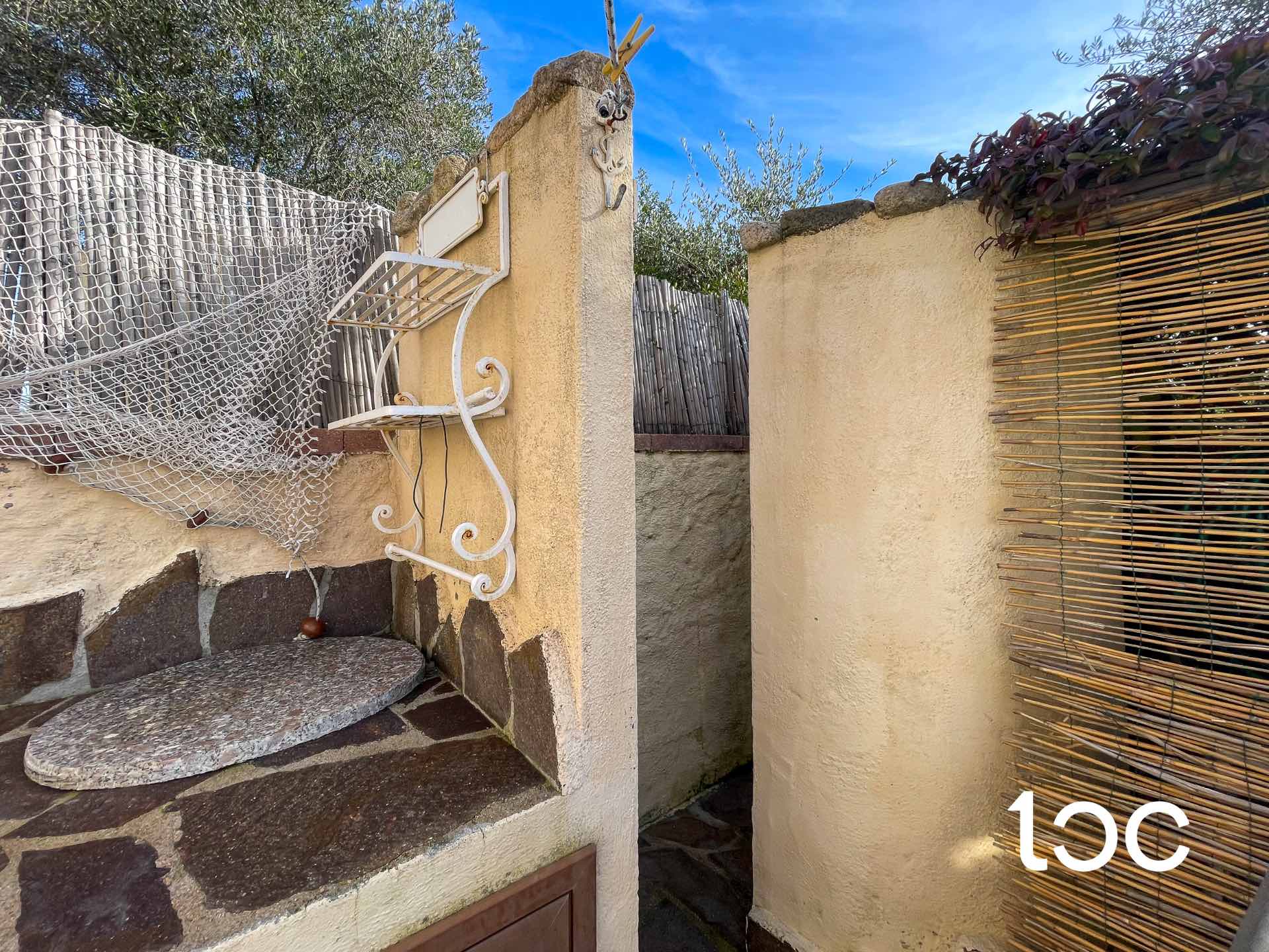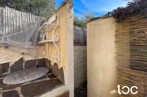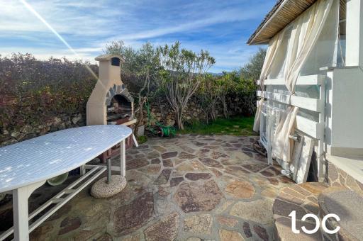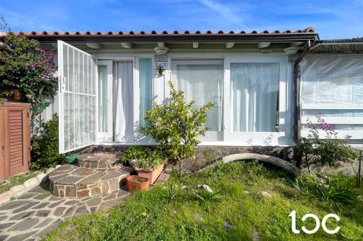 The entrance to the property welcomes us with a large and lush private garden, partly paved, embellished with lemon, myrtle and chili pepper plants. The outdoor space is equipped with a stone barbecue, outdoor shower, storage room and sink area, perfect for fully enjoying the days outdoors.